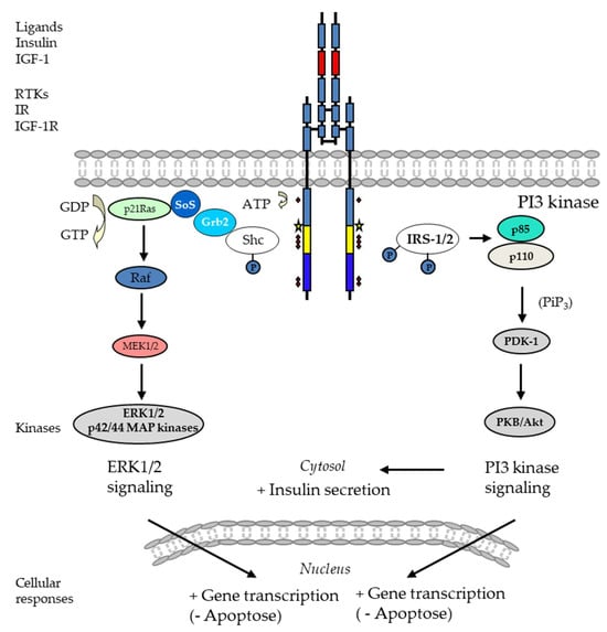 In humans, receptor tyrosine kinases (RTKs) consist of 58 integral cell surface membrane receptors gathered into 20 classes [112]. In the absence of ligands, RTKs are in a monomeric form composed of three domains: an extracellular ligand-binding domain, a single-pass alpha-helical transmembrane domain, and a cytosolic tyrosine kinase domain (TKD) (Figure 3) [112,113,114]. The binding of a ligand induces dimerization or, sometimes, the oligomerization of RTK monomers, which brings the kinase domains of two RTKs in close proximity. As a result of the dimer or oligomer’s formation, the TKD phosphorylates the tyrosine residues within the TKD of each RTK monomers [112,113,114]. The activation of TKD promotes the recruitment and activation of downstream signaling proteins [112,113,114,115]. The recruitment and activation of these proteins stimulate distinct signaling pathways such as ERK1/2, PI3K, protein kinase B (PKB/Akt), PKA, or PKC [112,113,114,115]. RTKs play pleiotropic functions by regulating cell growth, differentiation, and function [112,113,114,115]. Their role in promoting tumor cell growth is well described and has made this receptor family a major therapeutic target [112,113,114,115]. In beta-cells, several RTKs are expressed and play key roles in the control of insulin production, insulin secretion, beta-cell proliferation, and differentiation. As an example, insulin receptor (IR) and c-Kit regulate the trafficking and fusion of insulin-containing granules (for review, see [20]).