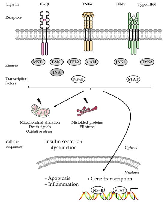 Cytokine receptors regulating beta-cell function and survival. Pro-inflammatory cytokines such as interleukin-1β (IL-1β) and tumor necrosis factor-α (TNF-α) induce the apoptosis and dysfunction of beta-cells through the activation of membrane receptors, intracellular protein kinases (i.e. serine/threonine kinase mammalian sterile 20-like kinase 1 (MST1), serine/threonine kinase transforming growth factor-β activated kinase-1 (TAK1, or MAP3kinase 7), tumor progression locus 2 kinase (TPL2, or MAP3kinase 8), cellular abelson tyrosine kinase (c-Abl), mitogen-activated protein kinases (MAPKs) such as c-Jun N-terminal kinases (JNK)), and nuclear factor-kappa B (NFκB) transcription factor. IFNγ and type I IFN induce the apoptosis and dysfunction of beta-cells through the activation of the membrane receptors, mammalian janus kinase 1 (JAK1) and tyrosine kinase 2 (TYK2), respectively, and signal transducer and activator of transcription (STAT). These signaling pathways lead to mitochondrial alterations and the release of death signals, endoplasmic reticulum (ER) stress, and the regulation of gene transcription.