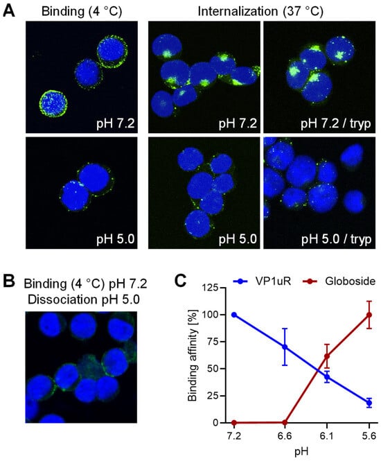 In a previous study, we found that B19V interacts with the glycosphingolipid globoside exclusively at mildly acidic pH (≈ 6.3) and that this interaction is required for the infection [28]. Globoside and VP1uR are both expressed in erythroid progenitor cells (EPCs) [25,27]. However, B19V does not bind to globoside exposed on the plasma membrane of EPCs because the interaction requires acidic conditions [28]. Accordingly, globoside does not play a role in virus binding and uptake, which is mediated by VP1uR. To investigate the effect of pH on the interaction of B19V with VP1uR, cells were incubated with recombinant VP1u under neutral (pH 7.2) or acidic (pH 5.0) conditions at 4 °C to allow binding and at 37 °C to allow internalization. Treatment of the cells with trypsin removed bound but not internalized proteins. As shown in Figure 1A, binding of recombinant VP1u was significantly reduced and internalization was abolished at low pH. VP1u bound at pH 7.2 was removed by exposing the cells to pH 5.0, indicating that VP1u dissociates from VP1uR when exposed to acidic conditions (Figure 1B).