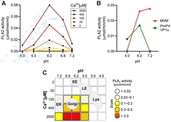 Identification of optimal enzymatic conditions for viral PLA2 activity. (A) The PLA2 activity of recombinant VP1u (1 µg) from B19V was assayed at pH 5.0–7.2 with increasing concentration of Ca2+. (B) The PLA2 activity of MVM (1010) and recombinant VP1u from PmPV (100 ng) was tested at pH 5.0–7.2 and 2 mM Ca2+. (C) Schematic depiction of different cellular organelles according to their pH and calcium concentrations superimposed on the optimal B19V PLA2 enzymatic conditions.