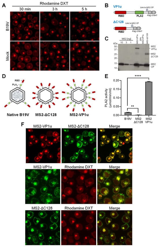 Native B19V typically harbors an average of three VP1u residues per capsid, which is less than the 5–10 copies per virion observed in other parvoviruses [1,40]. We sought to increase the PLA2 activity of B19V and test its effect on the endocytic vesicles. To this end, B19V VP1u subunits were incorporated into bacteriophage MS2 capsids, which do not interact with eukaryotic cells but have similar features to B19V, such as an icosahedral capsid of similar size [41,42]. Recombinant MS2 particles were labeled with the fluorescent dye Atto488 and bioconjugated with multiple full-length B19V VP1u containing the RBD and PLA2 domain (MS2-VP1u) or with a truncated VP1u construct without the PLA2 (MS2-∆C128) (Figure 4B). Western Blot analysis showed that the two VP1u constructs were successfully linked to MS2 capsids (≈ 15–18 per capsid) (Figure 4C). The resulting capsid constructs are schematically outlined in Figure 4D. The PLA2 activity of recombinant MS2-VP1u, native B19V, and MS2-∆C128 was quantitatively assessed. The PLA2 activity of MS2-VP1u was approximately 11 times higher than that of native B19V capsids. As expected, the activity of MS2-∆C128 was undetectable (Figure 4E). Both MS2 constructs were able to internalize UT7/Epo cells and accumulate in the endocytic pathway without noticeable differences (Figure 4F). UT7/Epo cells were incubated with MS2-VP1u or with MS2-∆C128 and tetramethylrhodamine-labeled dextran (3 kDa) at 37 °C for 30 min, washed to remove unbound particles, and further incubated for 1h. Despite the increased PLA2 potential, the accumulation of MS2-VP1u particles in the endosomes did not cause dextran release, indicating that the endosomal membrane remains intact (Figure 4F).