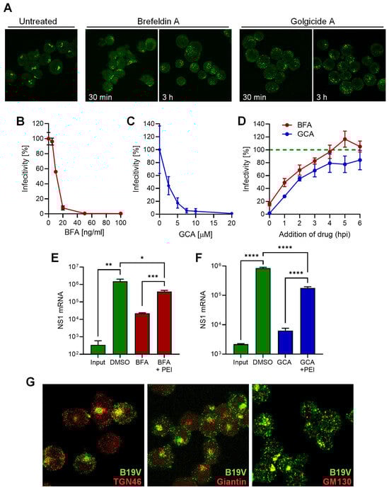 B19V entry requires a functional Golgi apparatus. (A) UT7/Epo cells were incubated with 50 ng/mL brefeldin A (BFA) or 20 µM golgicide A (GCA) for 30 min, 3 h, or left untreated. Cells were fixed and the Golgi apparatus was visualized with an anti-giantin antibody. Effect of increasing doses of BFA (B) or GCA (C) on B19V infection in UT7/Epo cells. Cells were pretreated with drugs for 15 min before addition of the virus. After 30 min at 37 °C, unbound virus was removed by a washing step and NS1 mRNA was quantified 24 hpi by RT-qPCR. (D) Effect of BFA (20 ng/mL) and GCA (10 µM) on B19V infection when added at progressive times post-infection compared to untreated cells (dotted green line). Effect of PEI on B19V infection in cell treated with BFA (E) or GCA (F). After drug treatment (BFA, 5 ng/mL; GCA, 10 µM) for 30 min, cells were infected with B19V (105 geq/cell). When indicated, PEI (1 µM) was added at 37 °C for 30 min. Cells were then washed and incubated in medium containing the drugs. After 24 h, NS1 mRNA was quantified by RT-qPCR. (G) Co-localization of B19V with Golgi markers. UT7/Epo cells were infected with B19V (105 geq/cell) at 37 °C for 30 min followed by a washing step to remove unbound virus. After 30 min, cells were fixed and stained with antibodies against intact capsids (green), and TGN46, giantin or GM130 (red). Results are presented as the mean of two (B–D) or three independent experiments for (E,F) ± standard deviation (SD). *, p < 0.05; **, p < 0.01; ***, p < 0.001; ****, p < 0.0001.