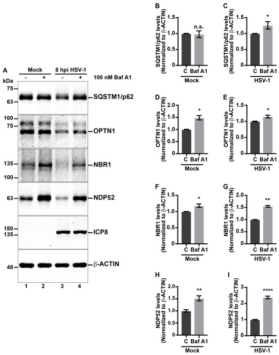 The degradation of autophagic receptors SQSTM1/p62, OPTN1, NBR1, and NDP52 during HSV-1 infection depends on the autophagic flux. H4 cells were either uninfected (mock) or infected with HSV-1 strain F at MOI 10. They were then treated with either vehicle DMSO (control) or 100 nM Baf A1 for 8 h to inhibit autophagic flux. Protein extracts were subjected to immunoblot using monoclonal antibodies against (A) SQSTM1/p62, OPTN1, NBR1, and NDP52. HSV-1 ICP8, an early protein, was used to control the infection. β-ACTIN was used as a loading control. Positions of molecular weight markers (kDa) are indicated on the left. Densitometric quantification of (B,C) SQSTM1/p62, (D,E) OPTN1, (F,G) NBR1, and (H,I) NDP52 protein levels were normalized to β-ACTIN. Statistical significance was determined by Student’s t-test. Bars represent means ± SD of biological replicates (SQSTM1/p62 n = 3; OPTN1 n = 3; NBR1 n = 3; NDP52 n = 3); n.s., not significant; * p < 0.05, ** p < 0.01, **** p < 0.0001.