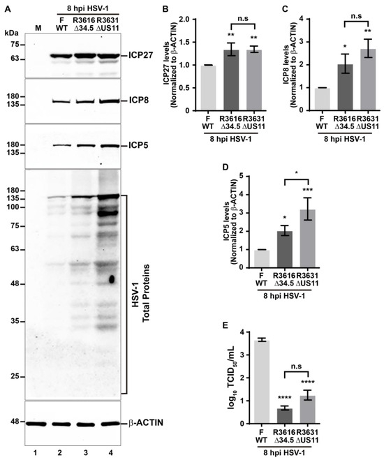 Because the roles of the viral proteins ICP34.5 and US11 in the virus–host interaction still need to be better addressed, we finally explored the influence of its removal in both intracellular viral protein levels and on HSV-1 progeny yield. To carry this out, H4 cells were infected with HSV-1 strain F and the mutant versions R3616 (ΔICP34.5) and R3631 (ΔUS11) for 8 hpi at MOI 10. Then, the soluble extracts were analyzed through immunoblot to examine several viral proteins as was conducted in Figure 6A (Figure 9A). From densitometric analysis of HSV-1 proteins, we observed that both mutant HSV-1 strains significantly increased the levels of ICP27 (Figure 9B), ICP8 (Figure 9C), and ICP5 (Figure 9D) compared to cells infected with HSV-1 strain F. When we compared the effect of the infection of HSV-1 strain R3616 (ΔICP34.5) with HSV-1 strain R3631 (ΔUS11), we found no significant differences in the levels of the viral proteins ICP27 and ICP8 (Figure 9B,C) but we found a significant increase in the levels of ICP5 (Figure 9D). Interestingly, from the analysis of HSV-1 total proteins (Figure 9A, fourth panel) we noticed a notable increase in both mutant HSV-1 strains compared to cells infected with strain F (Figure 9A, fourth panel, lanes 1–3). However, we detected a sharp increase in the HSV-1 total proteins in cells infected with strain R3631 compared to cells infected with strain 3616 (Figure 9A, fourth panel, lanes 2 and 3). Overall, we compared the production of HSV-1 progeny yield between the strains studied. We collected cell culture supernatants at 8 hpi and assessed the production of progeny virus using TCID50 titration in Vero cells. Notably, at 8 hpi, the viral titers of cells infected with both mutant strains were significantly reduced by roughly three orders of magnitude compared to cells infected with strain F (Figure 9E) and without significant differences between them (Figure 9E, bars 2 and 3).
