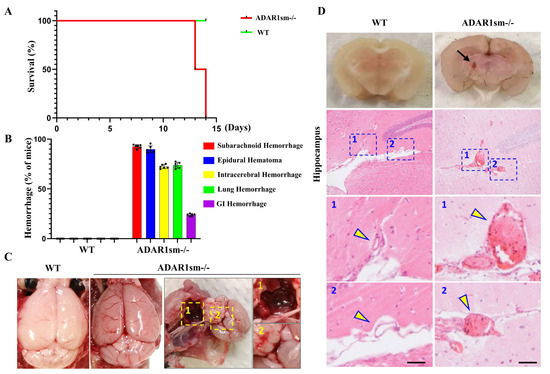 3.1. ADAR1sm-/- Causes Lethality in Mice Due to Extensive Hemorrhages