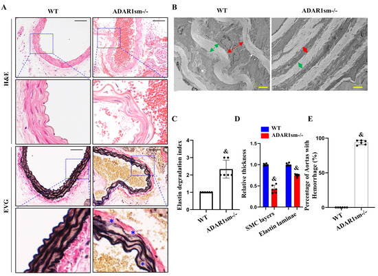 ADAR1 deletion in smooth muscle cells damages the integrity of elastin fibers. Myh11-CreERT2 (WT) and ADAR1sm-/- mice were injected with tamoxifen (1 mg/day, i.p. for 5 days). (A) H&E and EVG staining of thoracic aorta sections of WT and ADAR1sm-/- mice 13 days post-tamoxifen injection. * Breaks in elastin fibers. Scale bar: 50 μm. (B) Transmission electron microscopy (TEM) images of WT and ADAR1sm-/- mouse aorta segments 13 days post-tamoxifen injection. Green arrows indicate the thickness of elastin lamina, and red arrows the thickness of SMC layer. Scale Bar: 4 μm. (C) Quantification of the elastin degradation index in WT and ADAR1sm-/- mouse aortas. & p < 0.001 vs. WT, n = 6. (D) Quantification of the SMC layer and elastin laminae thicknesses in WT and ADAR1sm-/- mouse aortas. & p < 0.01 vs. WT, n = 6. (E) Quantification of hemorrhage events in aortas of WT and ADAR1sm-/- mice. & p < 0.001 vs. WT, n = 6.