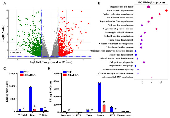 To determine the molecular mechanisms underlying ADAR1sm-/- arterial structure defects, we performed transcriptomic analyses for SMCs isolated from WT and ADAR1sm-/- mouse aortas via RNA sequencing. A volcano plot illustrated numerous genes that were up- or downregulated by ADAR1sm-/-, including a notable downregulation of Fibrillin-1, one of the important structural components in artery walls. Further Kyoto Encyclopedia of Genes and Genomes (KEGG) pathway enrichment analyses highlighted several biological pathways significantly impacted by ADAR1sm-/- (Figure 3B). These pathways are closely related to vascular functions and artery structural organization. RNA-seq analyses also revealed that ADAR1sm-/- profoundly diminished RNA editing, the key function of ADAR1. Most editing sites appeared to be within gene regions, especially in introns and 3′ untranslated regions (UTRs). The absence of ADAR1sm-/- SMCs exhibited dramatic reductions in editing activities in these sites (Figure 3C). Moreover, a significant proportion of editing occurred in repetitive regions of the genome, such as short interspersed nuclear elements (SINEs), long terminal repeats (LTRs), and long interspersed nuclear elements (LINEs). ADAR1sm-/- almost completely abolished RNA editing in these regions (Figure 3D), highlighting the importance of ADAR1 in maintaining genome stability and proper gene expression regulation in SMCs. These findings collectively indicate that ADAR1 is crucial not only for the structural integrity of artery walls but also for SMC functions and vascular health.