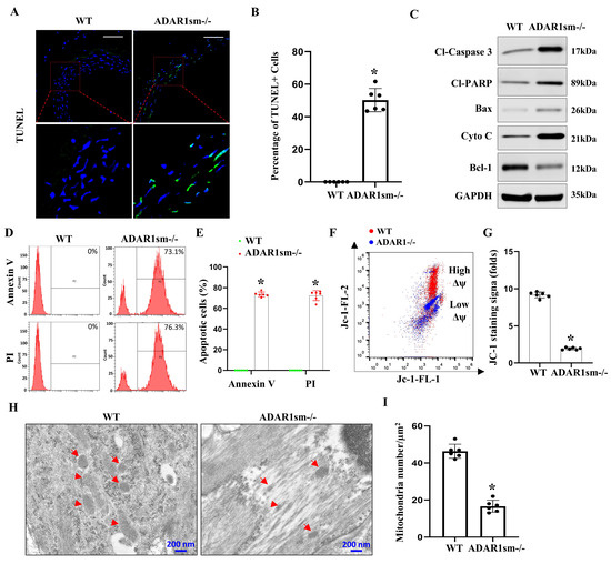 Western blot analyses showed increased protein levels of cleaved Caspase-3, cleaved PARP, Bax, and Cytochrome C but decreased BCL-1 expression in ADAR1sm-/- aortas (Figure 5C), suggesting the activation of mitochondrial apoptotic machinery by ADAR1sm-/- in SMCs. Flow cytometry analyses using PI and Annexin V staining of single-cell suspensions from the aorta media layers 13 days post-tamoxifen injection revealed dramatically higher apoptosis rates in ADAR1sm-/- aortas than WT aortas (Figure 5D,E), consistent with the results observed with TUNEL staining. Further investigations using JC-1 staining to assess mitochondrial membrane potential demonstrated a decrease in membrane potential in ADAR1sm-/- SMCs, as indicated by a shift from red to blue fluorescence, which signals mitochondrial depolarization and an increase in apoptotic cell populations (Figure 5F,G). Moreover, TEM imaging of the aortas revealed structural changes in mitochondria, with increased mitochondria damage in ADAR1sm-/- SMCs (Figure 5H,I), further confirming the involvement of mitochondrial dysfunction in the observed SMC apoptosis. Collectively, these results demonstrated that ADAR1sm-/- leads to SMC apoptosis through the mitochondrial pathway, highlighting ADAR1 as a protective factor against mitochondrial dysfunction and apoptosis in vascular cells.