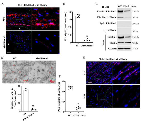 To further study how ADAR1sm-/- caused alterations in the ECM of the aortas, we detected the physical interactions between fibrillin-1 and elastin, the critical proteins for maintaining vascular integrity, by using the in situ proximity ligation (PLA) assay. Intensive fibrillin-1–elastin interactions were observed in WT aorta media layers (Figure 6A,B). However, the interactions largely disappeared or decreased in ADAR1sm-/- aortas, as evidenced by the sparse PLA signal (Figure 6A,B). Coimmunoprecipitation assays further confirmed the significantly decreased binding of fibrillin-1 with elastin in ADAR1sm-/- aorta protein extracts (Figure 6C). Their reduced interaction points to potential destabilization of the aortic ECM. Indeed, TEM imaging revealed the disrupted ECM microstructure, especially the disruption and reduction of fibrillin microfibrils in ADAR1sm-/- aortas (Figure 6D). These data suggest that ADAR1 plays a crucial role in stabilizing artery ECM protein complexes.