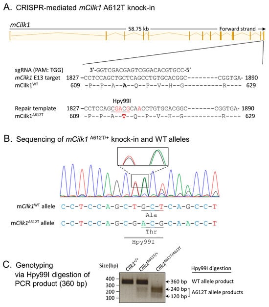 Generation of the Cilk1 A612T knock-in mouse model. (A) A schematic illustration of CRISPR/Cas9-mediated knock-in of the A612T mutation and an Hpy99I restriction enzyme cutting site within the mCilk1 mutant allele. (B) Sequencing results confirming designed mutations that not only converted Ala612 to Thr but also introduced a new Hpy99I site near A612T for genotyping. One silent base substitution (CAG→CAA) was also engineered to deter the recut of the repair template by Cas9 nuclease. (C) Genotyping results from Hpy99I-digested PCR products that can distinguish between the WT allele and the A612T mutant allele.
