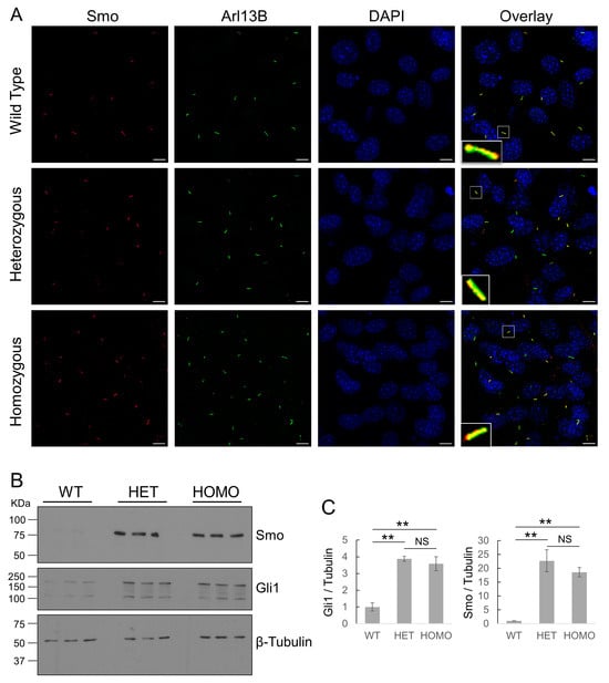 One test of cilia function is Hedgehog (Hh) signaling. The binding of an Hh ligand to its receptor Patched 1 (Ptch1) relieves Ptch1-mediated inhibition of Smoothened (Smo), causing Smo to translocate to the primary cilium for activation of downstream effectors such as Gli1 and Gli2. Smo translocation and activation can be induced by Hh agonists such as SAG. We treated wild-type MEF cells with either DMSO as a control or SAG (50 nM and 200 nM) to activate Hh signaling (Figure S1). We observed a significant accumulation of Smo in the primary cilium upon treatment with 200 nM SAG, based on Smo co-localization with the cilia marker Arl13B (Figure 3A and Figure S1). In comparison to WT cells, both heterozygous and homozygous A612T mutant cells showed statistically significant upregulation of Smo and Gli1 upon SAG stimulation (Figure 3B,C). Although the signals were weaker without added SAG, we did observe an increase in Hedgehog signaling in the variant vs. WT cells. There was no significant difference in the protein levels of Smo and Gli1 between the heterozygous and the homozygous mutant cells (Figure 3C). These results indicated that one Cilk1 A612T mutant allele was sufficient to upregulate the Hedgehog pathway, in particular in response to SAG stimulation.