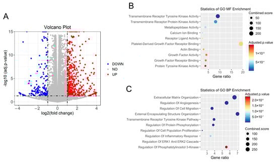 To further examine the effects of the Cilk1 variant A612T on signaling pathways, we applied RNA-seq analysis to WT and mutant MEFs to compare gene expression. A volcano plot of differentially expressed genes (DEGs) showed that 1286 DEGs were identified, including 931 upregulated genes and 355 downregulated genes (Figure 4A, Supplementary Table S1). We performed Gene Ontology (GO) enrichment analysis of DEG (Fold Change ≥ 2 and FDR < 0.001). Molecular function (MF) analysis revealed enrichment of gene expression changes in transmembrane receptor kinase activity (Figure 4B), which is consistent with the role of primary cilia in the compartmentalization and regulation of receptor tyrosine kinase pathways. Biological process (BP) analysis identified that these changes are mainly involved in the regulation of extracellular matrix organization, angiogenesis, and cell migration (Figure 4C). Importantly, both MF and BP analyses suggested that these changes are related to transmembrane receptor tyrosine kinase pathways and protein phosphorylation.