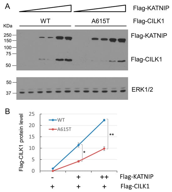 Recently, we showed that the scaffold protein KATNIP interacts with CILK1, increasing activation of the kinase and elevating levels of CILK1 in cells [8]. Given that the A615T mutation is located in the intrinsically disordered region of CILK1 that mediates interaction with KATNIP, we examined whether the A615T mutation affected KATNIP regulation of CILK1. We transfected HEK293T cells with Flag-CILK1 (WT or A615T) and co-transfected an increasing amount of Flag-KATNIP, and then quantified the protein levels of CILK1 on Western blots (Figure 5). KATNIP co-expression enhanced WT CILK1 levels more than 20-fold in a dose-dependent manner. In comparison, at the same doses, KATNIP was less than half as effective at increasing the protein level of the A615T mutant protein, a statistically significant difference (Figure 5B). This result indicates that KATNIP regulation of the CILK1 A615T variant protein was relatively deficient.