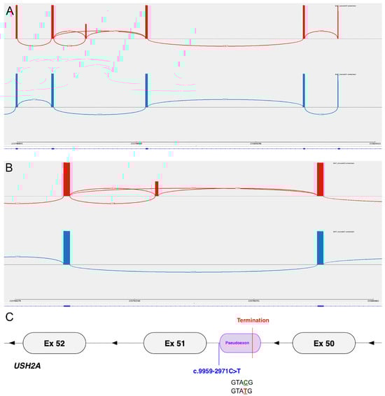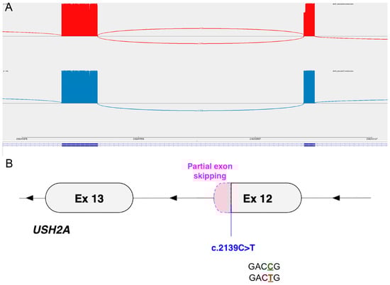 (A) Sashimi plot from IGV showing splice junctions for USH2A exons 12 and 13 of Patient 2 (top, red) and a control (bottom, blue). Exons are depicted from right to left (reverse strand, 3′ to 5′) with each bar depicting an exon and the height of the bars indicating the number of reads. The control (bottom, blue) exhibits the expected normal splicing. In contrast, Patient 2 (top, red) shows mis-splicing (partial exon 12 skipping) due to the variant. The reference USH2A transcript (NM_206933.4) is represented by the blue line at the bottom. (B) Graphical representation of the mis-splicing pattern in Patient 2 relative to the variant location and the mutant sequence.
