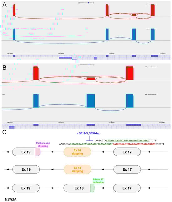 (A) Sashimi plot showing the splice junctions of Patient 3 (red, top) and a control (bottom, blue). USH2A exons 17–20 are depicted from right to left (reverse strand, 3′ to 5′). The patient sample (top, red) shows multiple mis-splicing events—the inclusion of the duplicated nucleotides (mapping as partial intron 17 inclusion) and exon 18 skipping with or without partial exon 19 skipping. The control sample (bottom, blue) shows canonical splicing. (B) Enlarged view of exons 17–19 from (A). (C) Graphical representation of the multiple mis-splicing events identified in Patient 3.