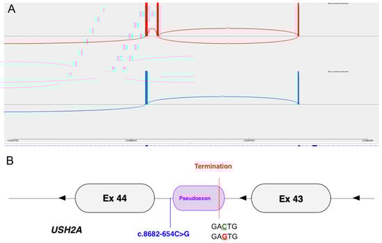 (A) Sashimi plot showing the splice junctions of Patient 4 (red, top) and a control (bottom, blue). USH2A exons 43–44 are depicted from right to left (reverse strand, 3′ to 5′), with each bar representing an exon and the height of the bars indicating the number of reads. The control (bottom, blue) shows canonical splicing only. The patient (top, red) shows mis-splicing—a pseudoexon inclusion of 130 bp. The reference USH2A transcript (NM_206933.4) is represented by the blue line at the bottom. (B) Graphical representation of the mis-splicing patterns in Patient 4, showing the mutant donor site motif.