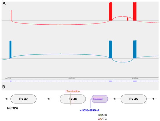 (A) Sashimi plot showing the splice junctions of Patient 5 (red, top) and a control (bottom, blue). USH2A exons 45–47 are depicted from right to left (reverse strand, 3′ to 5′) with each bar representing an exon and the height of the bars indicating the number of reads. The control sample (bottom, blue) shows only canonical splicing. The patient (top, red) shows mis-splicing—a pseudoexon inclusion of 78 bp in intron 45. The blue line at the bottom represents the reference USH2A transcript (NM_206933.4). The overall read depth was low due to short flow cell run time and low template in the library preparation. (B) Graphical representation of the mis-splicing pattern in Patient 5 showing the mutant donor site motif.