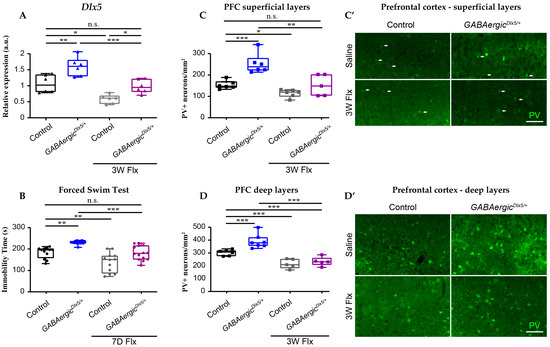 3.3. Dlx5 Overexpression in GABAergic Neurons Conteracts the Antidepressant Effects of Flx
