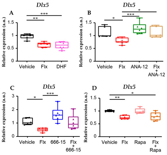 4.2. Flx Administration Affects Dlx5/6 Expression through the TrkB-CREB Signalling Pathway