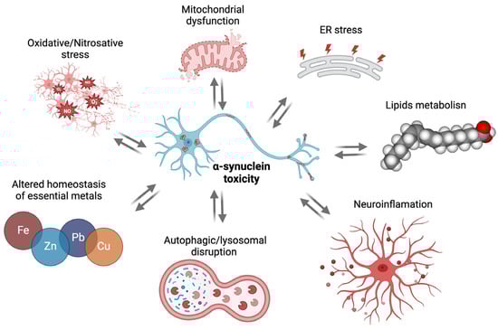 Bidirectional relationship between toxic αSyn species and cellular dysfunctions. Different factors are well known to contribute to the generation of misfolded toxic αSyn species. Additionally, abnormal levels or misfolded forms of αSyn impact several aspects of neuronal function, thus contributing to the pathogenesis of PD. Created with Biorender.com.