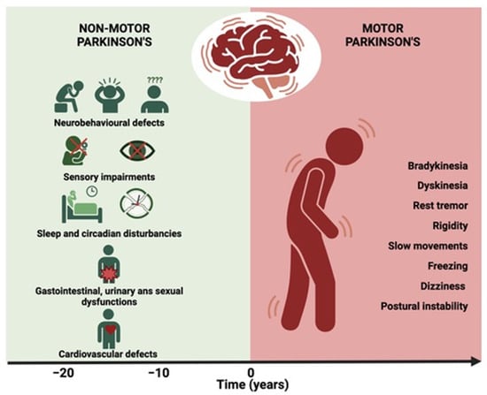 Parkinson’s disease (PD) is one of the most common neurodegenerative disorders, second only to Alzheimer’s disease, and refers to α-synucleinopathies characterized by loss of the dopaminergic and monoaminergic neurons in substantia nigra pars compacta (SNpc) and ventral tegmental area, as well as by the accumulation, aggregation and spread of α-Synuclein (αSyn) within neurons and non-neuronal cells including microglia, pericytes, astrocytes, and oligodendrocytes [1]. PD is the most common form of movement disorder clinically manifested by bradykinesia, resting tremor, rigidity, slowness of movement, freezing, dizziness, and postural instability as a result of the loss of 70–80% of the dopaminergic neurons in the SNpc [2]. Aside from motor manifestations, PD impacts a plethora of non-motor symptoms (NMS) which may predate the onset of movement disorders by several years [3,4]. They include alterations in the sense of smell [5,6], dysfunction of circadian rhythms [7], and autonomic disorders such as orthostatic hypotension constipation, urinary difficulties, gastrointestinal disorders, anxiety, depression, and impairment or loss of sensory perception [4,8,9]. Non-motor manifestations have been recognized as significant contributors to the overall impact of the disease on the individual’s quality of life [10,11,12].
