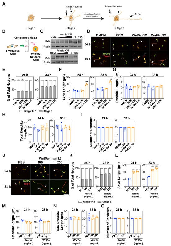 Wnt5a promotes axon outgrowth. (A) Stages of neuronal polarity. (B) A schematic of the experimental setup. Dissociated E15.5–16.5 mouse cortical neurons were treated with conditioned media (CM) isolated from control L cells and L cells stably expressing Wnt3a or Wnt5a. (C) Wnt3a- and Wnt5a-CM promote Dvl2 phosphorylation. MDA-MB-231 cells were treated with control-conditioned media (CCM), different dilutions of Wnt3a- or Wnt5a-CM, 10X concentrated (10X) CM, or the filtrate (Fil) for 4 h. Lysates were immunoblotted for Dvl2 and actin. (D–O) Cortical neurons were treated with Wnt-CM (D–I) or commercially available recombinant Wnt5a (100 and 250 ng/mL) (J–O), 4 h after plating. Neurons were fixed at 24 and 33 h, and the neuronal morphology was examined in neurons immunostained for MAP2 (dendrites, green) and Tau-1 (axons, red). Representative images are shown. Arrowheads mark the axon. Scale bar, 50 μm (D,J). (E–I,K–O) The average percentage of neurons in stages 1–3 (E, K), the length of the Tau-1-positive axon (F,L), the MAP2-positive individual dendrite lengths (G,M), the total dendrite lengths (H,N), and the total number of dendrites (I,O) were quantified. Values are plotted either as mean ± SEM (E,K) or an average of the median ± SEM from three independent experiments (F–I,L–O). In neuronal quantifications, each dot represents the median from at least 13 (for 24 h in panel F,L) or 30 (for all others) neurons from one of the three independent experiments. In panels F and L, for the 24 h group, the median was determined from a minimum of 13 neurons per experiment due to a greater percentage of neurons lacking a Tau-1-positive axon. Statistical significance: *** p < 0.001 using a one-way ANOVA with Dunnett’s post-test (F–I,L–O), or a two-way ANOVA with Tukey’s post-test (E,K).