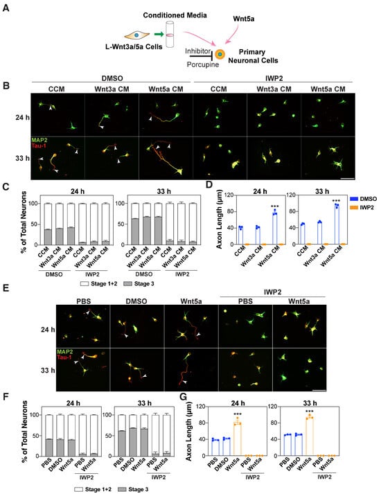 Autocrine Wnt signaling mediates Wnt5a-induced axon outgrowth. (A–G) Dissociated E15.5–16.5 mouse cortical neurons were treated with control-conditioned media (CCM) and Wnt3a- or Wnt5a-CM (B–D) or commercially available Wnt5a (100 ng/mL) (E–G) in the absence or presence of the Porcupine inhibitor, IWP2 (10 μM), 4 h after plating. Neurons were fixed at 24 and 33 h, and the neuronal morphology was examined in neurons immunostained for MAP2 (dendrites, green) and Tau-1 (axons, red). Representative images are shown. Arrowheads mark the axon. Scale bar, 50 μm (B,E). Average percentage of neurons in stages 1–3 (C,F) and the length of the Tau-1-positive axons (D,G) are plotted. Values are plotted either as mean ± SEM (C,F) or as an average of the median ± SEM from three independent experiments (D,G). In the neuronal quantifications, each dot represents the median from at least 13 (for 24 h in panel D,G) or 30 (for all others) neurons from one of the three independent experiments. In panels D and G, for the 24 h group, the median was determined from a minimum of 13 neurons per experiment due to a greater percentage of neurons lacking a Tau-1-positive axon. In panels D and G, no axon length data could be obtained for the IWP2-treated neurons as IWP2 blocked axon formation. Statistical significance: *** p < 0.001 using a one-way ANOVA with Dunnett’s post-test (D,G), or a two-way ANOVA with Tukey’s post-test (C,F).