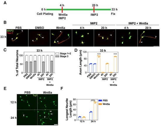 To further examine how endogenous Wnt secretion is linked to Wnt5a-induced outgrowth of the prospective axon, we next investigated the effect of blocking Wnt secretion at different phases of neuronal polarization. For this, we compared the effect of adding IWP2 to the neuronal cultures both during and after Wnt5a treatment (Figure 4A). As observed above (Figure 2), the addition of IWP2 together with Wnt5a, 4 h after plating, inhibited the outgrowth of the longest neurite (Figure S2C,D) and prevented axon formation and impaired the Wnt5a-induced axon elongation at 33 h (Figure 4B–D). In contrast, the addition of IWP2 at 20 h after plating (i.e., 16 h after Wnt5a addition) did not affect neuronal polarization and resulted in an increase in the axon length at 33 h. This indicates that the secretion of neuronal Wnts is critical in the early phase, but not in the later phase of neuronal polarization. Moreover, exogenous Wnt5a appears to act in a distinct (later) timeframe, to promote axon elongation. Consistent with this, the analysis of the neurites at 12 h after plating, when the neurites are short, revealed that Wnt5a had no effect on neurite lengths (Figure 4E,F), which contrasts with the enhanced elongation observed at 24 and 33 h (Figure 1F,L, Figure 2D,G and Figure 3B,E). Taken together, these observations suggest that endogenous Wnts and exogenous Wnt5a each might act during specific time windows to control neuronal polarization and axon outgrowth.