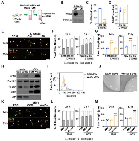 Wnt5a-containing sEVs promote axon outgrowth. (A) A schematic of the experimental setup. Small EVs (100,000× g pellet) were purified from Wnt5a-CM using differential centrifugation. (B–D) Wnt5a is predominantly present in the sEV pellet. Representative immunoblot of Wnt5a (B), respective quantification (C), and total protein (D) in 50 mL of the original Wnt5a-CM (CM) and the sEV-depleted supernatant (SN) obtained after ultracentrifugation at 100,000× g from four independent batches is shown. (E–G) sEV-depleted Wnt5a-CM cannot promote axon outgrowth. (H) Representative immunoblotting of the cell lysates and sEV pellets (100,000× g) for the EV markers CD81, Flotillin1, and TSG101 and the ER protein, calnexin (CNX). (I) A nanoparticle tracking analysis (NTA) of the differential centrifugation pellets. A representative plot indicating the particle size distribution from three independent purifications is shown. (J) Representative transmission electron microscopy (TEM) images of the sEV-containing pellets. Arrowheads indicate round vesicles. Scale bar, 200 nm. (K–M) Wnt5a-containing sEVs promote axon outgrowth. (E–G,K–M) Cortical neurons were treated with sEV-containing or sEV-depleted Wnt5a-CM (E–G), and sEVs from control-conditioned media (CCM) or Wnt5a-CM (all at 5 μg/mL) (K–M), 4 h after plating. Neurons were fixed at 24 and 33 h, and the neuronal morphology was examined in Tau-1-/MAP2-stained neurons. Representative images (E,K) and quantifications indicating the average percentage of neurons in stages 1–3 (F,L) and Tau-1-positive axon lengths (G,M) are shown. Arrowheads mark the axon. Scale bar, 50 μm (E,K). Values are plotted either as mean ± SEM (C,D,F,L) or as an average of the median ± SEM from three independent experiments (G,M). In neuronal quantifications, each dot represents the median from at least 13 (for 24 h in panel G,M) or 30 (for all others) neurons from one of the three independent experiments. In panels G and M, for the 24 h group, the median was determined from 13 neurons per experiment due to a greater percentage of neurons lacking a Tau-1-positive axon. Statistical significance: *** p < 0.001 using an unpaired t-test (C,D), a one-way ANOVA with Dunnett’s post-test (G,M), or a two-way ANOVA with Tukey’s post-test (F,L).