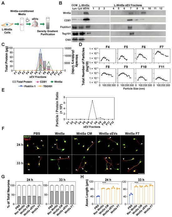 Wnt5a-containing sEVs isolated using density gradient purification promote axon outgrowth. (A) A schematic of the experimental setup. Small EV pellets (100,000× g) purified from the conditioned media (CM) of L-Wnt5a cells using differential centrifugation were subjected to iodixanol discontinuous density gradient purification. (B) Wnt5a is present in fractions containing sEVs. A small EV pellet (100,000× g) was loaded on top of a discontinuous gradient and ultracentrifuged for 16 h. Twelve fractions were collected from the top and analyzed using immunoblotting for Wnt5a, the ER protein calnexin (CNX), and EV markers, including CD81, Flotillin1, and TSG101. (C) The intensity of the bands from (B) is plotted against the amount of the protein. (D) Particle size distribution was determined using NTA. (E) Fraction 7 (F7) has the highest particle number/protein ratio. (F–H) F7 fraction promotes axon elongation. Cortical neurons were treated with recombinant Wnt5a (100 ng/mL), Wnt5a-CM, crude sEVs (5 μg/mL), or F7 fraction (5 μg/mL), 4 h after plating. Neurons were fixed at 24 and 33 h, and the neuronal morphology was examined in Tau-1-/MAP2-stained neurons. Representative images (F) and quantifications indicating the average percentage of neurons in stages 1–3 (G) and Tau-1-positive axon lengths (H) are shown. Arrowheads mark the axon. Scale bar, 50 μm (F). Values are plotted either as mean ± SEM (G) or an average of the median ± SEM from 3 independent experiments (H). In the neuronal quantifications, each dot represents the median from at least 13 (for 24 h in panel H) or 30 (for all others) neurons from one of the three independent experiments. In panel H, for the 24 h group, the median was determined from 13 neurons per experiment due to a greater percentage of neurons lacking a Tau-1-positive axon. Statistical significance: *** p < 0.001 using a one-way ANOVA with Dunnett’s post-test (H), or a two-way ANOVA with Tukey’s post-test (G).