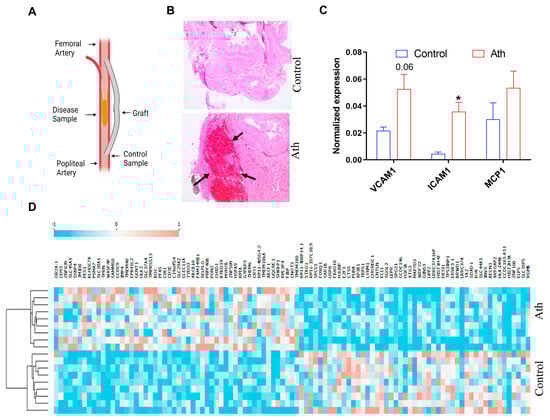 RNA sequencing from atheromatous tissues obtained from subjects undergoing femoro-popliteal bypass surgery shows altered gene expression profiles. (A) Schematic shows the site of sample collection. (B) H&E staining showing atheromatous tissue as compared with control (atheromatous plaque sample). Arrows indicate a plaque region of the sample marked by dense eosin staining. (C) Normalized gene expression profiles of ICAM1, VCAM1, and MCP1 in atheromatous tissue (Ath) and control tissue, n = 3, * p < 0.05, Mann–Whitney U test. (D) Heatmap of top differentially regulated genes identified through RNA sequencing. Each column of the heatmap represents one sample. Genes are clustered using k-means clustering.