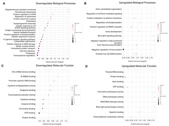 Altered biological processes associated with PAD. (A) Downregulated biological processes in PAD. (B) Upregulated biological processes. (C) Downregulated molecular functions. (D) Upregulated molecular functions associated with PAD. The color scale in bubble plots indicates a log p-value, the size of the bubble denotes number of genes represented, and X-axis represents the log10 value of fold enrichment.