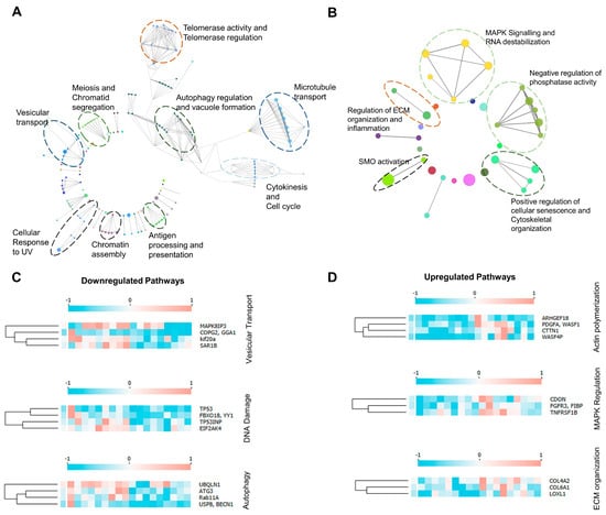 Key downregulated biological processes comprised autophagosome assembly (FE = 6.97, p < 0.05), vesicle mediated transport (FE = 4.23, p < 0.05), and cellular response to DNA damage (FE = 2.74, p < 0.05) (Figure 2A, Table S4). Autophagosome assembly and vesicle transport included genes such as BECN1, ATG3, RAB11A, UBQLN1, and SAR1B. Upregulated biological processes included enrichment of actin cytoskeleton organization (FE = 4.18, p < 0.05) and actin filament polymerization (FE = 8.9, p < 0.05) (Figure 2B). The pathways identified are indicative of multiple dysregulated pathways primarily related to endothelial cells and macrophages, both crucial drivers of disease progression. Upregulated pathways also included focal adhesion genes, MAPK signaling and TCR signaling (Figure S2B, Table S3). Downregulated molecular functions included pre-mRNA intronic binding (FE = 27.5, p < 0.05) and R-SMAD binding (FE = 10.48, p < 0.05) (Figure 2C), and upregulated molecular functions were DNA photolyase (FE = 76, p < 0.05), DNA helicase activity (FE = 76, p < 0.05), etc. (Figure 2D, Table S3). Overall, the gene ontology from upregulated genes indicated a pro-inflammatory milieu and a significantly higher actin polymerization. Pathway enrichment network analyses revealed novel pathway interactions such as telomerase regulation and autophagy regulation (Figure 3A). The pathways identified using upregulated genes were found to be independent of each other (Figure 3B). Figure 3C,D show differentially expressed genes in the pathways identified.