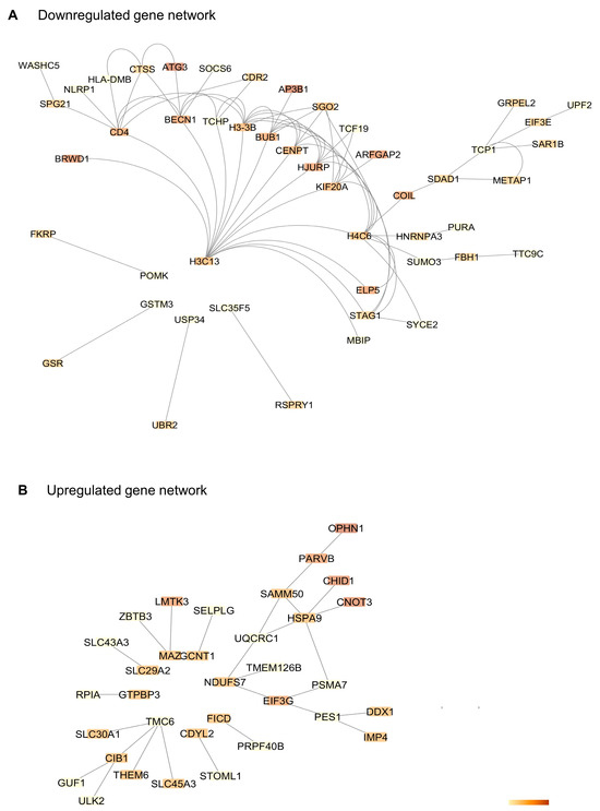 Gene network interactions in PAD. (A) Downregulated gene network of top 100 downregulated genes in PAD showing H3C13 having the most interactions. (B) Upregulated gene network of the top 100 upregulated genes in PAD. Gene network interactions were studied using STRING and visualized using Cytoscape. The color scale represents the shortest average path length.