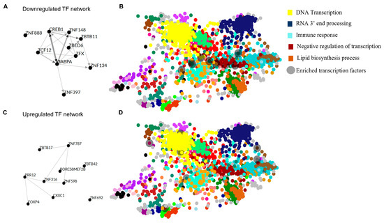 The search tool for the retrieval of interacting genes (STRING) (https://string-db.org) was used to construct gene networks. Cytoscape software version 3.10.0 was used to visualize the networks. Upregulated gene network analysis had 86 nodes and 91 edges with average number of neighbors being 2116, and downregulated gene network analysis had 196 nodes, 452 edges, and an average number of neighbors of 4612. Gene network analysis using the STRING database of the top 100 downregulated genes predicted novel interactions among genes such as CD4 and Beclin1 as well as CTSS, which is known to be impaired in atherosclerosis [21]. H4C6, a histone coding gene, interacted with STAG1, KIF20A, and other histone protein coding genes such as H3-3B (Figure 4A). Solute carrier family genes such as SLAC30A1, TMC6, and SLAC45A3 clustered together in the upregulated gene network analysis. Mitochondrial and metabolism-related genes such as NDUFS7, TMEM126B, and EIF3G were clustered together, indicating a metabolic impairment in atherosclerosis (Figure 4B). Together, the gene interaction network analysis of downregulated genes predicted novel networks relating to autophagy and T-lymphocyte function as well as interactions among histone protein coding genes and genes related to DNA stability. Novel interactions of mitochondrial genes with cytoskeletal genes such as PARVB were observed in the downregulated set. Downregulated TFs (transcription factors) enriched in the dataset included CREB1, GABPA, and TCF12 (Figure 5A), and the upregulated TF network included ZNF316 and FOXP4 (Figure 5C). Most of the downregulated transcription factors in the network pertained to immune response and lipid biosynthesis (Figure 5B), while bioprocesses like negative regulation of transcription, DNA transcription, and RNA3′ processing were upregulated (Figure 5D).
