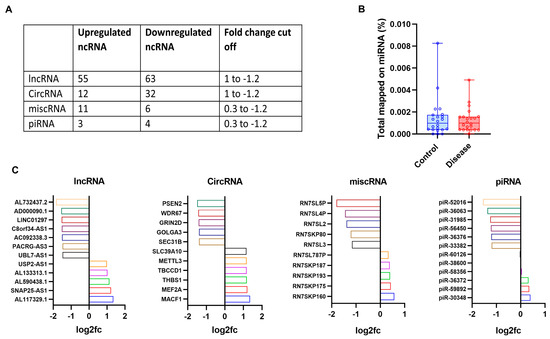 Non-coding RNAs in PAD provide insights to underlying dysregulated mechanisms. (A) The table shows the number of upregulated and downregulated non-coding RNAs identified along with the respective fold change cut off values used in the study. (B) The percentage of sequences from RNA-sequencing mapped to the miRNA database. (C) Bar plots showing a differential expression of non-coding RNAs as identified using miR Master v2.0 in a PAD cohort.