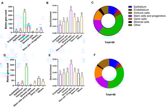 To understand the cellular subtypes that differentially regulated genes could be attributed to in PAD, we imputed cell fractions in PAD from the list of upregulated and downregulated genes using the CellMarker 2.0 database. Figure 7A shows downregulated genes mapped to different cell types, and Figure 7D shows upregulated genes mapped to specific cell types. A total of 59 contributing cell types were identified within the downregulated gene list (Figure 7C), and 56 cell types in the upregulated gene list (Figure 7F, Table S6). The cell types were then divided into seven categories depending on their biological function. Stromal cell markers were enriched with a gene enrichment of 0.033 in both upregulated and downregulated gene lists (Figure 7B,E). Immune cell markers were the highest mapped gene markers in both upregulated and downregulated genes, 183 and 234, respectively (Table S7).