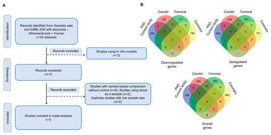 Meta-analysis across atherosclerosis studies: (A) Flowchart showing the methodology for the screening of available gene expression datasets using ‘atherosclerosis and human’ as keywords. A total of 4 datasets were used for meta-analysis after screening. (B) Venn diagram showing common and unique genes across this study (PAD_Current study), carotid artery atheroma (Carotid) (GSE43292), femoral artery disease (Femoral) (Tampere Vascular Study, 2017), and coronary artery disease (Coronary) (E-GEOD-40231). Venn diagrams were generated using bioinformatics.psb.ugent.be/webtools/Venn (accessed on 14 June 2024).