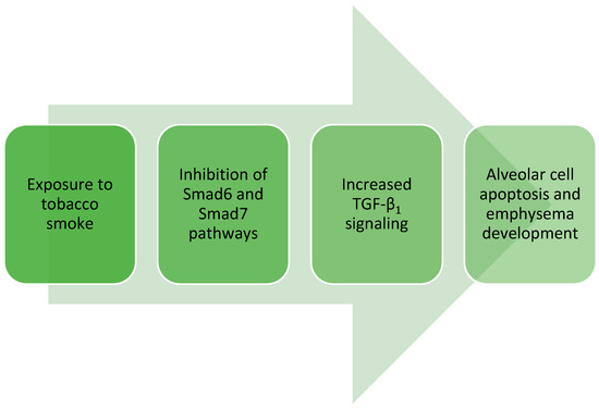 TGF-β contributes to the thickening of the walls of small alveoli and their fibrosis, revealed by studies performed on a mouse model. Tobacco smoke inhibits the Smad6 and Smad7 pathways, which inhibit TGF-β1 signaling. As a result, an enhancement in TGF-β1 signaling was observed, which may contribute to alveolar cell apoptosis and the development of massive emphysema (Figure 2). However, other studies indicate that also TGF-β1 deficiency contributes to the development of emphysema [32].