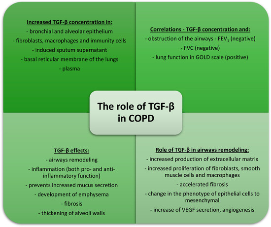 Many researchers investigated the level of TGF-β in COPD patients. In a study conducted on smokers and former smokers, people with COPD had approximately twice the level of TGF-β1 mRNA and TGF-β1 proteins in the bronchial and alveolar epithelium than smokers and ex-smokers who did not have COPD [24]. Moreover, the amount of TGF-β in the induced sputum in people with COPD was higher than in healthy people, including people who were smoking regularly [25]. Another study found a correlation between the amount of TGF-β in cells present in the sputum cells and the severity of obstruction of the airways. Moreover, it confirmed its increased level in COPD patients [26]. Increased TGF-β levels were also revealed in smokers’ basal reticular membrane of the lungs, and the increase was especially well-marked in COPD patients [27]. An increase in TGF-β levels in COPD patients was also observed. TGF-β levels correlated negatively with forced expiratory volume in the first second (FEV1) and forced vital capacity (FVC) [22]. In another study, increased TGF-β concentration in serum was found in COPD patients and was associated with lung function in the GOLD scale [28]. Moreover, in the study comparing the level of TGF-β1 in 59 smoking and 66 non-smoking pregnant women, there was a significantly higher concentration of TGF-β1 in blood of smoking women [29]. On the contrary, Kokturk et al. found no significant differences in TGF-β1 expression in bronchial biopsies between COPD and healthy groups. However, their study included only 13 COPD and 10 healthy participants [30].