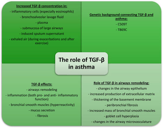 The role of TGF-β in asthma was described earlier in 2002 by Duvernelle et al. Excessive expression of TGF-β1 mRNA was described in a population of asthmatics with moderate and high disease severity. The most involved cell types in asthma are inflammatory cells, especially activated eosinophils. It is relevant that TGF-β has a dual function—it can be both a pro-inflammatory cytokine (participating in chemotaxis, proliferation, activation, differentiation, and viability of inflammatory cells and in the release of other pro-inflammatory cytokines and reactive oxygen species by cells building the respiratory tract) and anti-inflammatory (inhibiting the proliferation of T and B lymphocytes and participating in the suppression of Th2 lymphocytes and the production of other cytokines). Studies in mice confirmed this hypothesis—mice with hypoexpression and overexpression of TGF-β showed similar characteristics of inflammation. The role of TGF-β in remodeling the respiratory tract was also noticed and was determined to be dominant in this process compared to platelet-derived growth factor (PDGF) and insulin-like growth factor (IGF-1). The involvement of TGF-β has been associated mainly with fibrotic processes in the lungs and thickening of the basement membrane [50]. It is known that the pro- or anti-inflammatory role of TGF-β may depend on the microenvironment and cellular conditions [51].