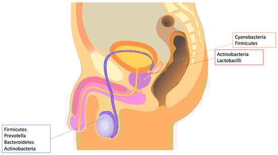 - Lundy, S.D.; Sangwan, N.; Parekh, N.V.; Selvam, M.K.P.; Gupta, S.; McCaffrey, P.; Bessoff, K.; Vala, A.; Agarwal, A.; Sabanegh, E.S.; et al. Functional and Taxonomic Dysbiosis of the Gut, Urine, and Semen Microbiomes in Male Infertility. Eur. Urol. 2021, 79, 826–836. [Google Scholar] [CrossRef]