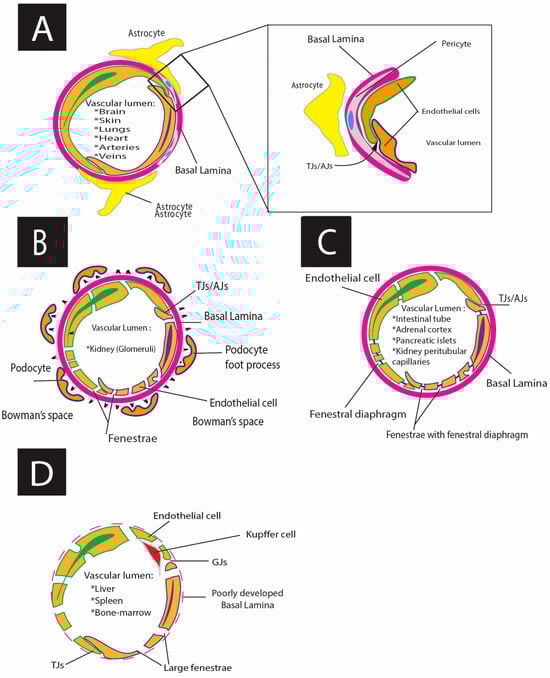 Schematic representations of different types of endothelium: (A) Schematic drawing of continuous endothelium; (B) schematic drawing of fenestrated endothelium (glomerular fenestrated endothelium (true fenestrated), with fenestrae ~60–100 nm in diameter), TJ (tight junctions), and AJ (adherens junctions); (C) schematic drawing of pseudo fenestrated endothelium with fenestral diaphragm (FD (fenestrae ~60–70 nm in diameter); and (D) schematic drawing of discontinuous sinusoid endothelium with GJs (gap junctions), TJs, and large pores ~100–200nm.