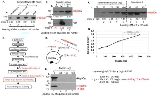 Approximately 5 μg of isolated exosomes collected from a conditioned medium of MDA-MB-231 cells were resuspend in a final volume of 0.1 mL of PBS with indicated concentrations of trypsin for 30 min at 37 °C with moderate agitation (Thermomixer 5436, Eppendorf, Hamburg, Germany). In comparison, 30 mL of EV-depleted Sup was concentrated to 0.1 mL using Amicon® Ultra-4 Centrifugal filters, Ultracel-50K (UFC805024, Millipore Sigma, MA, USA), and incubated in PBS with indicated concentrations of trypsin for 30 min at 37 °C with moderate agitation. Purified human rHsp90α protein with indicated concentrations was used in a trypsin digestion assay as a positive control.
