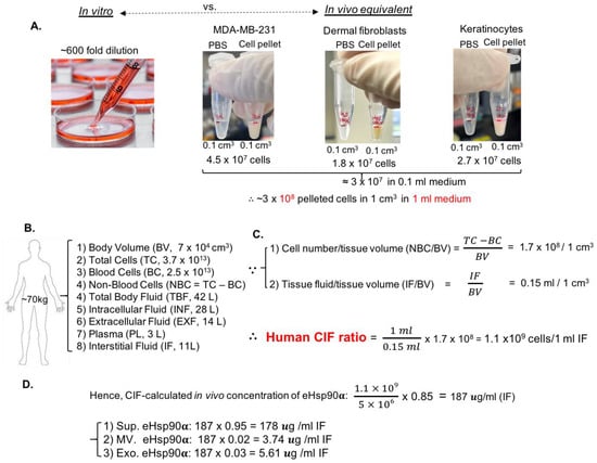 Therefore, in order to investigate the physiological relevance of the 3-D measurement in vitro, we calculated the ratio of cell number vs. interstitial fluid volume (CIF) for human tissues for the first time. Briefly, for a 70 kg human being, as shown in Figure 3B, the body fluids can be classified into intracellular fluid and extracellular fluid, with a total volume of 42 L. The intracellular fluid resides in the cytoplasm of cells and is estimated at around 28 L. The extracellular fluid has a total volume of 14 L, including the 3 L of plasma (blood) in circulation, the rest being 11 L of interstitial fluid in tissues [,,]. Then, the total body volume and the total number of cells in the body are 70,000 cm3 and 3.7 × 1013, including 2.5 × 1013 blood cells and 1.2 × 1013 non-blood tissue cells, respectively [,]. Therefore, the human body parameters shown in Figure 3B allowed us to calculate the ratio of the cell number to the surrounding interstitial fluid volume in tissues. As shown in Figure 3C, since 1 cm3 tissue is calculated to contain approximately 1.7 × 108 cells and 0.15 mL of interstitial fluid, the human CIF ratio is estimated at 1 × 109 cells/mL of interstitial fluid. Based on 0.85 μg eHsp90α/5 × 106 cells from cell culture (see Figure 2), the amount of secreted eHsp90α in wounded human tissues should be 187 μg/mL, which consists of 178 μg/mL of eHsp90α in EV-depleted Sup (95%) and 9.35 μg/mL of eHsp90α in EVs (5%), as calculated in Figure 3D. Remarkably, the amount of 178 μg/mL of eHsp90α in EV-depleted Sup perfectly matches the previously reported 100–300 μg/mL of rHsp90α protein that promotes maximum wound healing in both mouse and pig wound-healing models [,,,]. In contrast, secreted exosomes are not sufficient for providing the functional concentration of eHsp90α to promote wound healing. In conclusion, we have established the human CIF ratio in vivo that accurately predicts the tissue concentration of a secreted protein from CM. Using eHsp90α as a marker, we will prove the usefulness of CIF as follows.