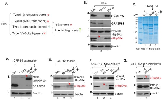 There are two parallel upstream regulators of the secretory autophagy pathway [,]. First, we tested the family of the Golgi reassembly-stacking protein genes, GRASP-55 and GRASP-65, using GRASP-55- and GRASP-65-knockout (KO) Hela cell lines [,]. Figure 4B shows the evidence of GRASP-55 KO (panel a, lane 2) and GRASP-65 KO (panel b, lane 3) in comparison to the unchanged intracellular Hsp90α (panel c). Interestingly, the amount of secreted eHsp90α was selectively reduced in GRASP-55-KO cells by approximately 50% (panel d, lane 2 vs. lane 1, as indicated by a red arrow), and remained unchanged in GRASP-65-KO cells (lane 3). This inhibition of eHsp90α secretion was not due to global inhibition of protein secretion by the cells, since the overall protein secretion by GRASP-55-KO cells was indistinguishable from the parental or GRASP-65-KO cells, as shown by Coomassie blue staining of the total CM of the three cell lines (Figure 4C). To verify that the inhibition of eHsp90α secretion was specifically due to the absence of GRASP-55, we carried out a rescue experiment by re-expressing a GFP-GRASP-55 cDNA into the GRASP-55-KO cells. As shown in Figure 4D, the parental Hela cells express abundant GRASP-55 (panel f, lane 1) and the GRASP-55-KO cells lack any detectable GRASP-55 (lane 2). Lentiviral infection-mediated re-expression of GFP-GRASP-55 shows a similar level to the endogenous GRASP-55 (lane 3 vs. lane 1). Under these conditions, as shown in Figure 4E, GFP-GRASP-55 rescued the lost secretion of eHsp90α in GRASP-55-KO cells (panel i, lane 3 vs. lane 2). The intracellular Hsp90α (panel h) and β-actin (panel j) were included as sample loading controls. To confirm the finding in different cell lines, we carried out lentiviral shRNA-mediated knockdown of GRASP-55 and GRASP-65 in MDA-MB-231 cells. As shown in Figure 4F, downregulation of GRASP-55, but not GRASP-65, partially reduced secretion of eHsp90α (panel l, lane 2 vs. lanes 1 and 3, as indicated by a red arrow). Similarly, as shown in Figure 4G, downregulation of GRASP-55 (panel n, lane 2 vs. lane 1) partially reduced the amount of secreted eHsp90α (panel n, lane 2 vs. lane 1, as indicated by a red arrow) in primary human keratinocytes. Intracellular Hsp90α (panel o) and β-actin (panel p) were included as loading controls. This finding is consistent with the previous reports that GRASP proteins regulate autophagy-mediated secretion of IL-1β [] and released IL-1β is in the form of a soluble protein rather than being contained within a vesicle [].