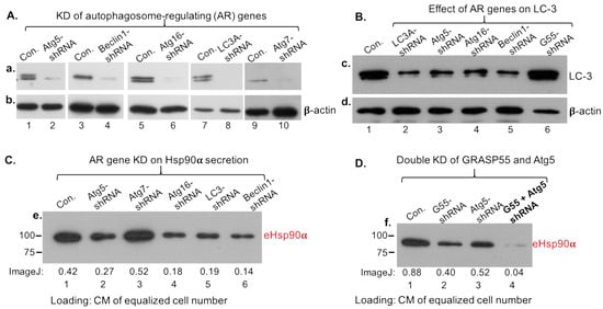 Next, we investigated the autophagosome-regulating (AR) family of genes, including initiation gene Beclin1, elongation genes Atg5 and Atg16 and maturation gene LC3, with Atg7 as a control. As shown in Figure 5A, lentiviral infection-delivered shRNA effectively downregulated the five genes (lanes 1 to 10) in MDA-MB-231 cells. Under these conditions, as shown in Figure 5B, the surface marker of the late autophagosomes, LC-3 (or LC-3B), was dramatically reduced (lanes 2–5 vs. lane 1), indicating disruption of autophagosome formation. GRASP-55 shRNA was included as negative control for specificity (lane 6). Similar to the partial effect of GRASP-55 KO, we found that downregulation of Beclin1, Atg5, Atg16 or LC3A partially blocked the secretion of eHsp90α (Figure 5C, lanes 2, 4, 5 and 6 vs. lane 1), whereas downregulation of Atg7 slightly enhanced secreted eHsp90α (lane 3). Considering both partial inhibitions of eHsp90α secretion, we tested whether double knockdowns of both GRASP55 and AR genes have addictive inhibitions of eHsp90α secretion. As shown in Figure 5D, individual downregulation of GRASP55 and Atg5 each partially reduced secretion of Hsp90α (panel f, lanes 2 and 3 vs. lane 1). However, double knockdowns of both genes almost completely blocked Hsp90α secretion (lane 4). We did not expect 100% blocking of eHsp90α secretion, because the level of gene downregulation was around 80–85%.