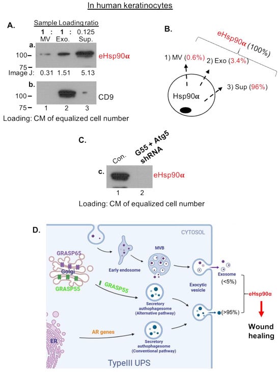 To confirm the above findings in human keratinocytes, the essential cell type for wound healing, we repeated the key experiments using human keratinocytes. Similarly, we separated CM of human keratinocytes into MV, Exo and Sup fractions, as illustrated in Figure 2B. The differential loadings of the three fractions on SDS gel were due to drastic variations of eHsp90α among the fractions and made sure to achieve simultaneous visualization of eHsp90α from all three fractions by Western immunoblotting analysis with anti-Hsp90α antibody. As indicated in Figure 6A, the amount of eHsp90α in MV and Exo even from eight times more cells than in Sup showed dramatically less eHsp90α than in Sup (panel a, lanes 1 and 2 vs. lane 3). The exosome marker CD9 was included in the SDS-PAGE to indicate successful fractionation by sequential ultracentrifugation (panel b, lane 2). Based on the data from ImageJ scanning, the distributions of eHsp90α are 0.6% in the MV fraction, 3.4% in the Exo fraction and 96% in the EV-depleted Sup fraction (Figure 6B), which is compatible with MDA-MB-231 cells (see Figure 2D). Similar to the finding in MDA-MB-231 cells, double knockdowns of both GRASP55 and Atg5 expression completely blocked eHsp90α secretion (Figure 6C). Taken together, we concluded these findings as schematically illustrated in Figure 6D. The amount of EV-mediated secretion of eHsp90α, as previously reported, is insufficient for executing the function of promoting wound healing. Instead, the secretory autophagy pathway supplies the 100–300 μg/mL dosage range of secreted eHsp90α for optimal wound healing in vivo.
