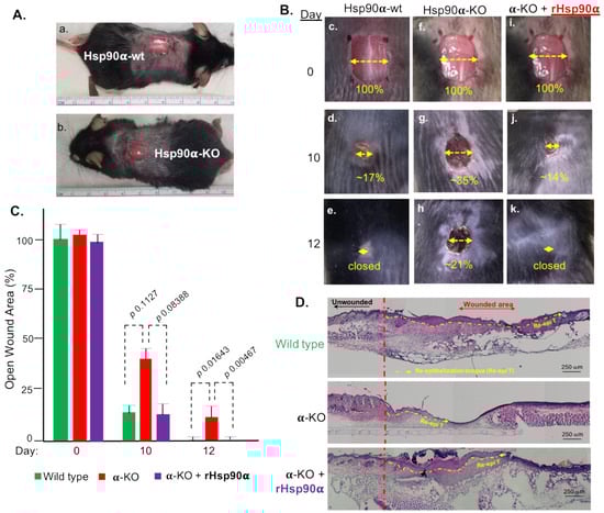 - Bhatia, A.; O’Brien, K.; Guo, J.; Lincoln, V.; Kajiwara, C.; Chen, M.; Woodley, D.T.; Udono, H.; Li, W. Extracellular and Non-Chaperone Function of Heat Shock Protein-90α Is Required for Skin Wound Healing. J. Investig. Dermatol. 2018, 138, 423–433. [Google Scholar] [CrossRef] [PubMed]