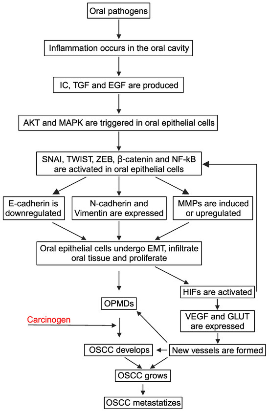 In this context, environmental or infectious mutagens can promote the malignant transformation of the trans-differentiated and/or proliferating oral epithelial cells, leading to the onset of an OSCC: thus, EMT is related to the OPMD transformation into OSCC [4,45,46] (Figure 1).